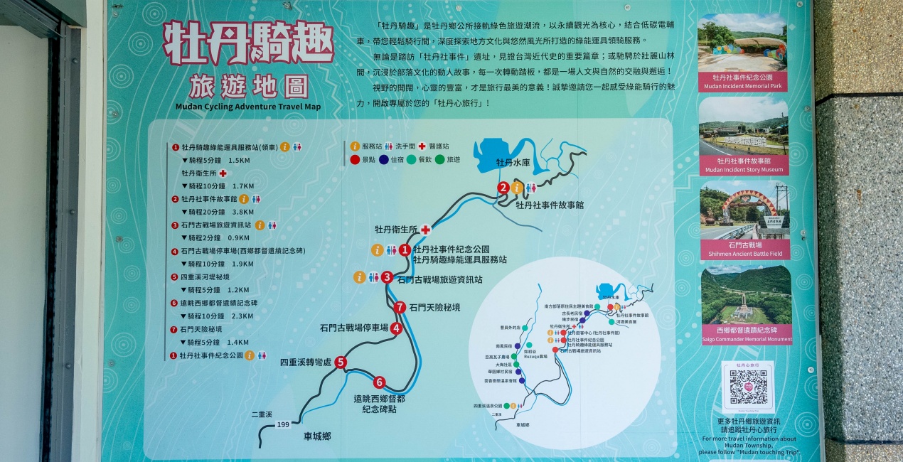 牡丹鄉電輔車租借「牡丹社事件紀念公園站」位於重要歷史場域旁,是認識牡丹社事件發生地的最佳起點。從此站出發,旅人可騎乘電輔車輕鬆穿梭部落與山林之間,沿途造訪牡丹社事件相關地景,體會族群記憶與在地文化的深刻底蘊。電輔車的輕鬆騎行讓旅程更自在,不僅能貼近在地文化歷史、欣賞自然風貌,也能以更沉浸的方式感受牡丹的故事與生命力,是深度旅遊與慢旅行的理想選擇。